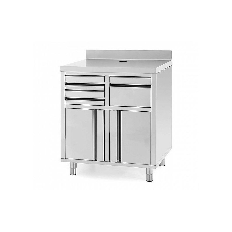 Cajones, puertas y tolva con tirador integrado. Separación entre estantes de 330, 225 y 200 mm; Patas regulables hasta 200 mm. Dim. Fondo: 600 mm Ancho: 820 mm Alto: 1050 mm